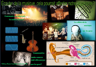 L`affiche, organisée selon le plan du groupe, contient trois chapitres : Comment se produisent les ondes sonores?, Comment les ondes sonores sont-elles perçues par les gens? et Les effets de la musique sur la santé. En plus, les photos, nous les avons mises pour illustrer les sous-chapitres que chaque partie de l`affiche contient.