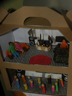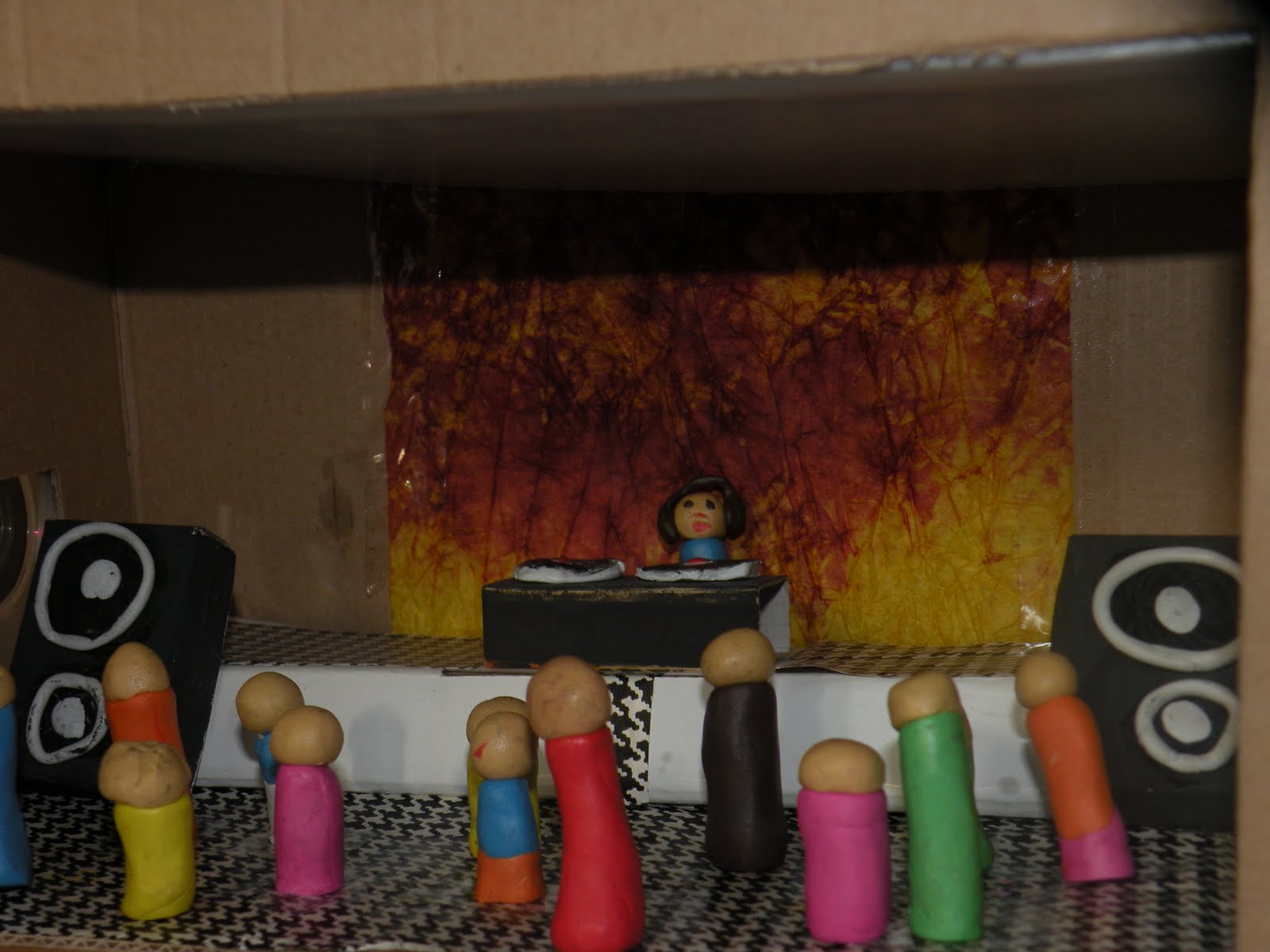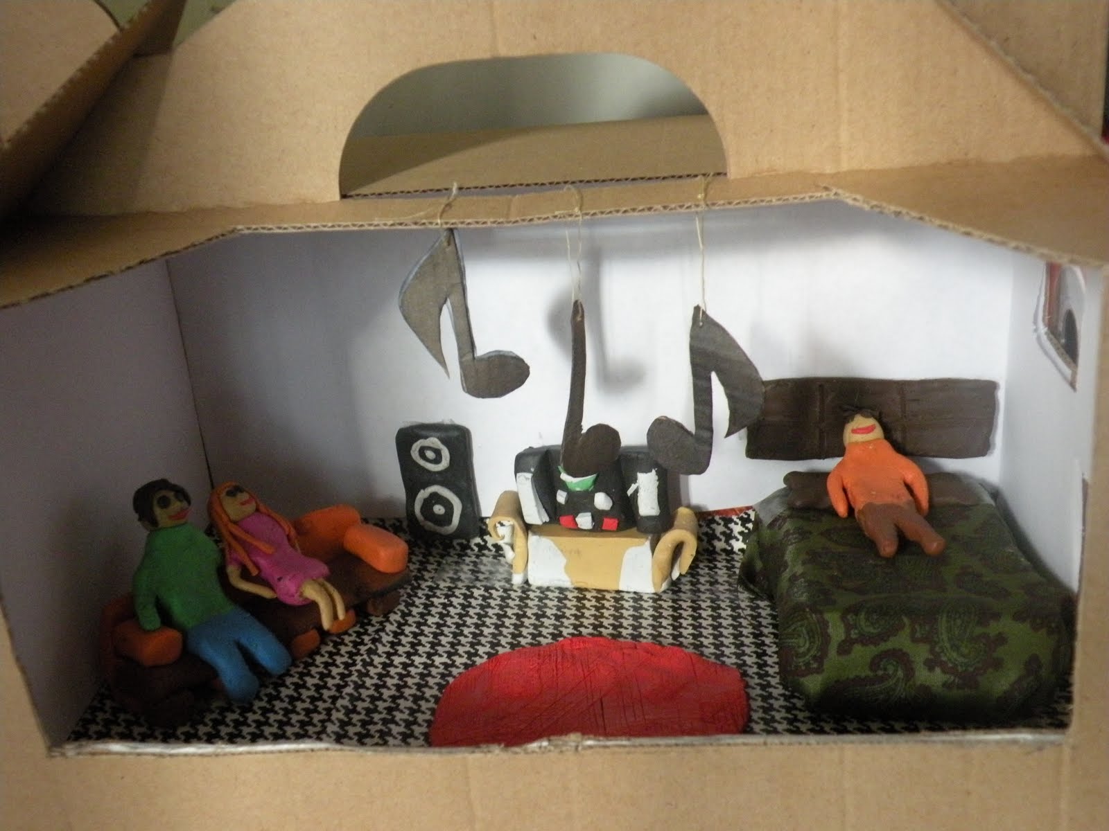 Ensuite, nous avons choisi de faire, comme un autre produit final, une maquette en carton. Nous l'avons construite, sur deux niveaux: au rez-de-chaussée il y a un concert et à l'étage se trouve un adolescent qui se détend avec ses amis, en écoutant de la musique, à la maison. Nous avons eu l'intention de mettre en évidence le fait qu'on peut trouver la musique presque partout, qu'elle fait partie de nos vies. C'est pourquoi nous l'avons appelée " Boite de la musique".